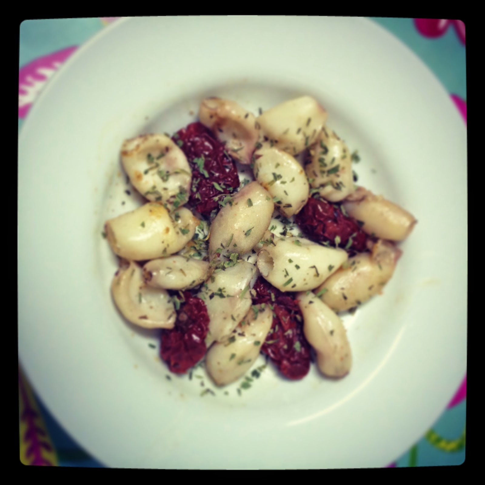 Hoje o cansaço da semana foi mais forte e venceu-me...A ementa não está completa, mas o apetite também não era grande...assim o menu foi: Lulas Salteadas com Tomate Seco e Estragão.
